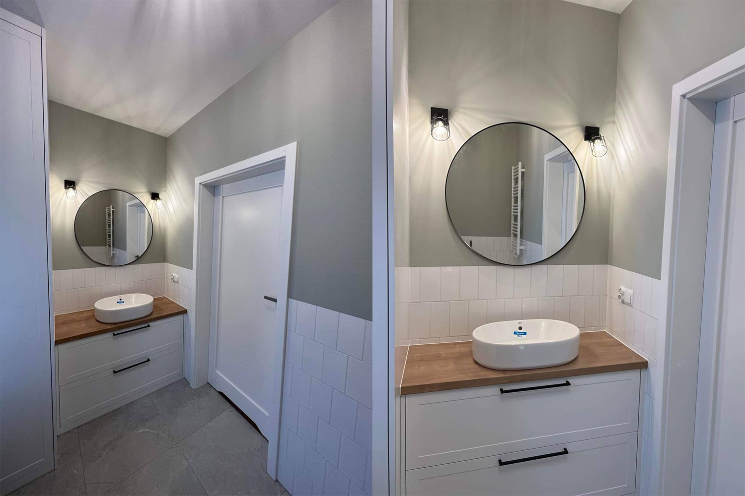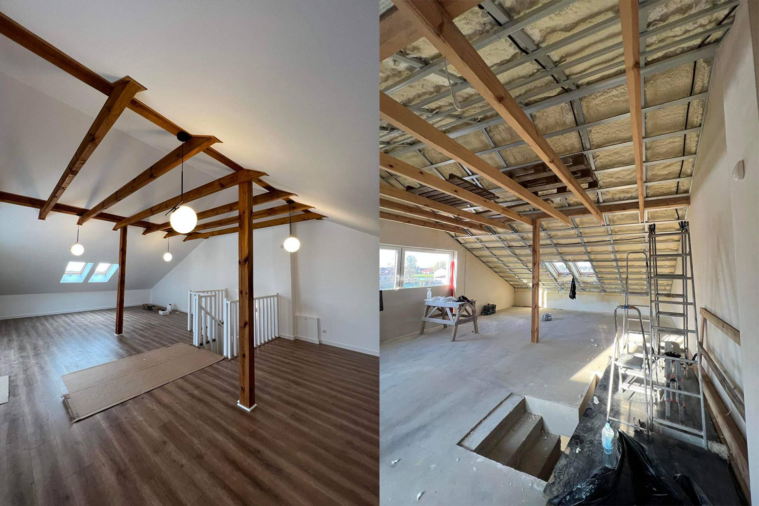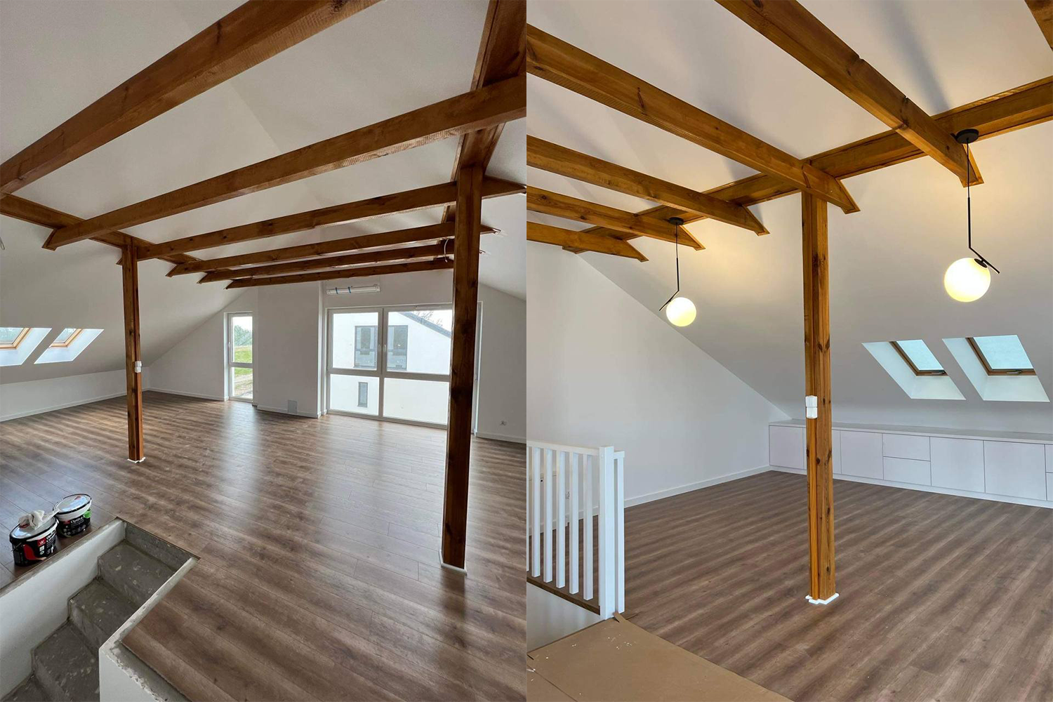 Zamontowanie ozdobnych paneli na ścianach w przedpokoju i salonie. Ułożenie podłóg. Wykończenie 2 łazienek z zabudową GK, ułożenie płytek na ścianach i podłogach oraz biały montaż. Wykończenie poddasza oraz montaż oświetlenia