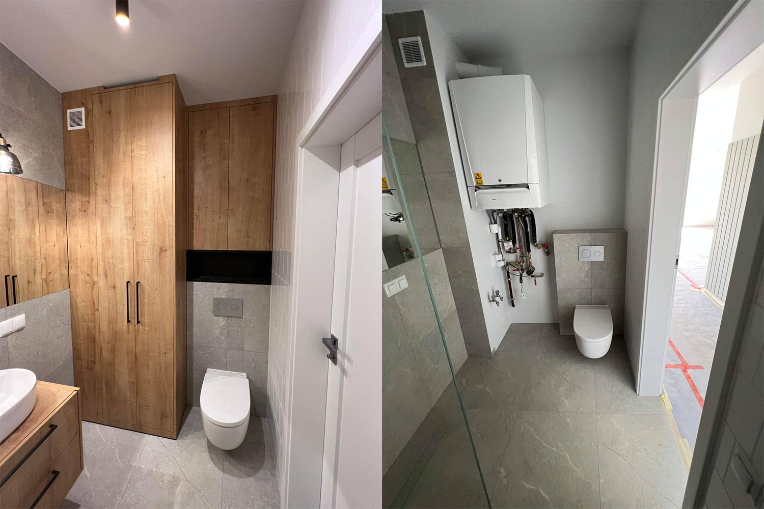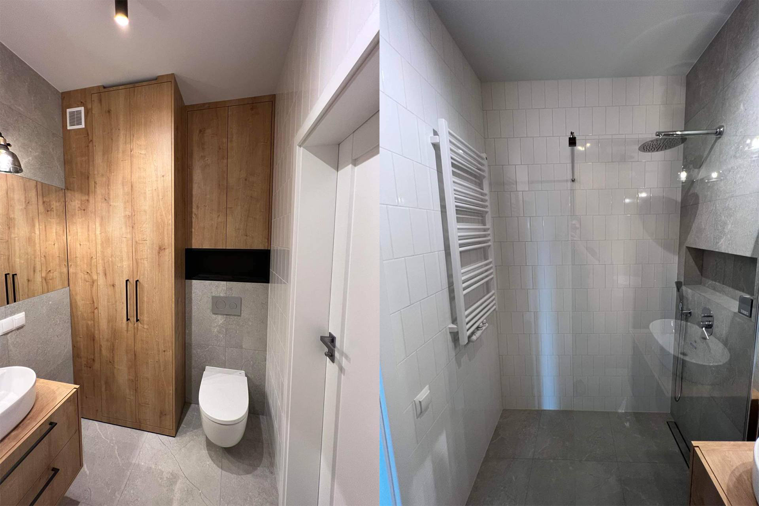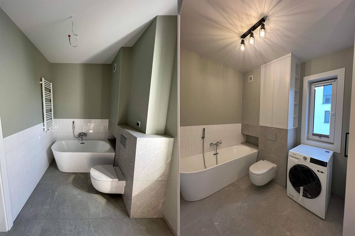 Zamontowanie ozdobnych paneli na ścianach w przedpokoju i salonie. Ułożenie podłóg. Wykończenie 2 łazienek z zabudową GK, ułożenie płytek na ścianach i podłogach oraz biały montaż. Wykończenie poddasza oraz montaż oświetlenia